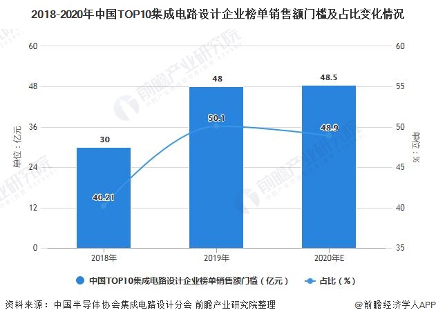 根据中国半导体协会集成电路设计分会2019年11月公布的《2019年中国十大芯片设计厂商(未统计港澳台地区)的营收数据预测报告》显示,2019年中国前十大集成电路设计企业的总销售约1558.0亿元,占全行业产业规模比例的50.1%,而2018年同期为40.21%。