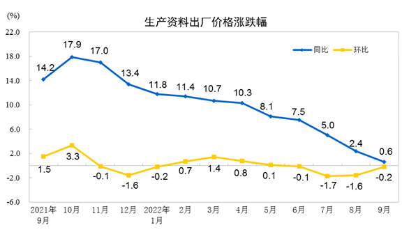 2022年9月份,全国工业生产者出厂价格同比上涨0.9%,环比下降0.1%;工业生产者购进价格同比上涨2.6%,环比下降0.5%。1—9月平均,工业生产者出厂价格比去年同期上涨5.9%,工业生产者购进价格上涨8.3%。